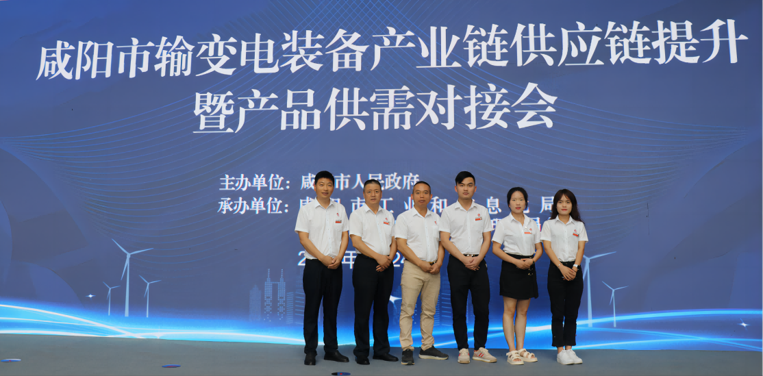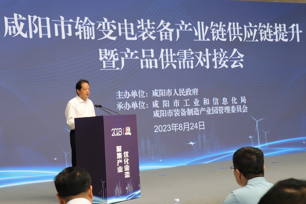2023 年 8 月 24 日上午 09:30,由咸陽市人民政府主辦、咸陽市工信局、咸陽裝備制造產業園管委會協辦的咸陽市輸配電產業鏈供應鏈提升暨產品供需對接會如期在咸陽市裝備制造園會議廳隆重舉行,出席本次會議的有咸陽市副市長李忠平、市政府副秘書長吳凱、產業園管委會書記劉輝、市工信局局長李森及各區縣主管工業的領導和園區重點企業代表約300余人參加,我公司作為本次輸配電產業鏈骨干企業應邀參加了本次會議。